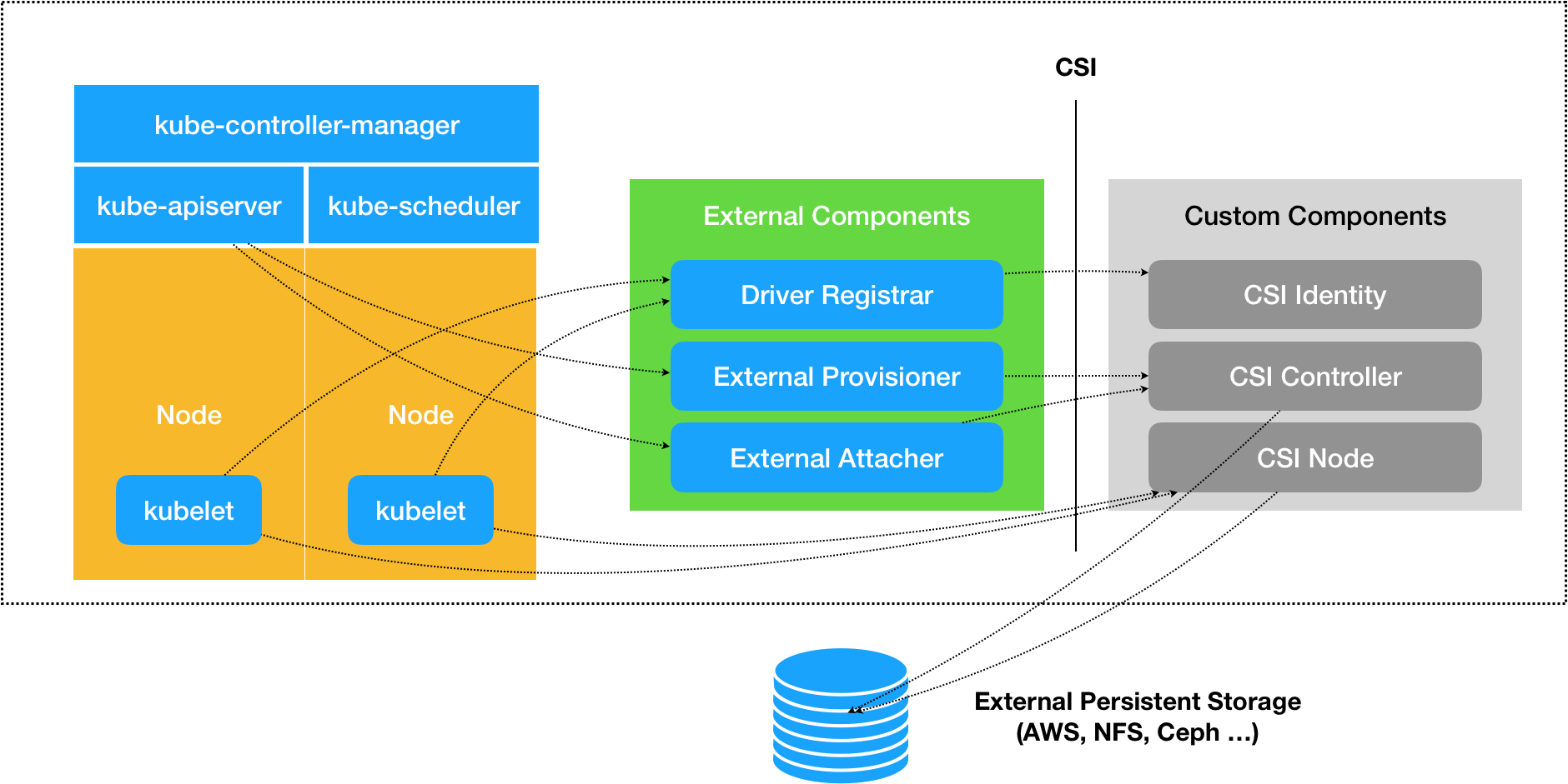 可以看到,这套存储插件体系多了三个独立的外部组件(External Components),即:Driver Registrar、External Provisioner 和 External Attacher,对应的正是从 Kubernetes 项目里面剥离出来的那部分存储管理功能。