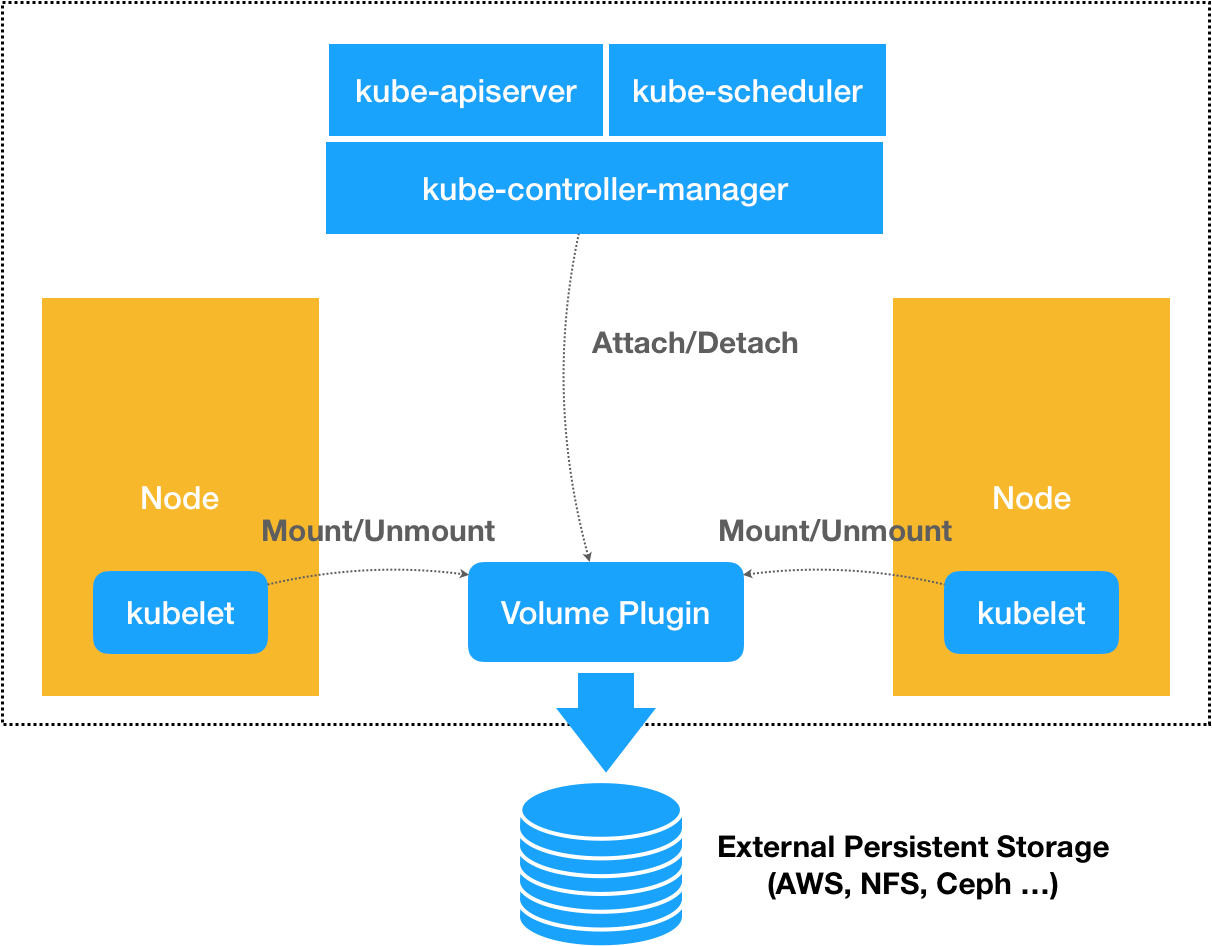 其实,通过前面对 FlexVolume 的讲述,你应该可以明白,默认情况下,Kubernetes 里通过存储插件管理容器持久化存储的原理,可以用如下所示的示意图来描述: