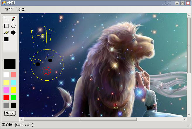 主要实现功能:画直线,矩形,橡皮,圆形,切换颜色,打开图片,保存图片,清除图片,手动调节画布大小;软件刚启动时,为一张空白画布,我们可以直接在画布上绘画,也可以通过菜单中的“打开”,导入一张图片,然后我们就可以在这张图片上进行绘制。