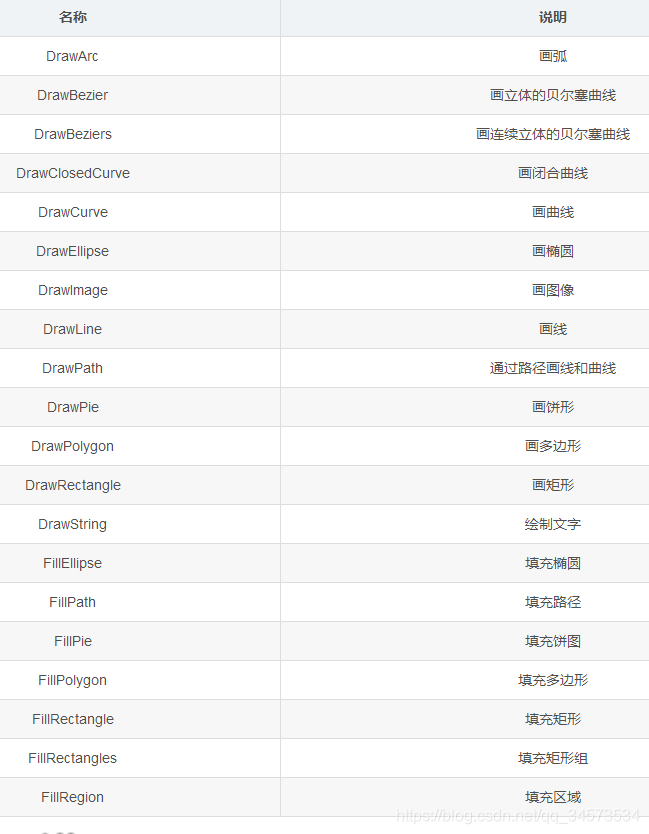 有了一个Graphics的对象引用后,就可以利用该对象的成员进行各种各样图形的绘制,表7.1列出了Graphics类的常用方法成员。