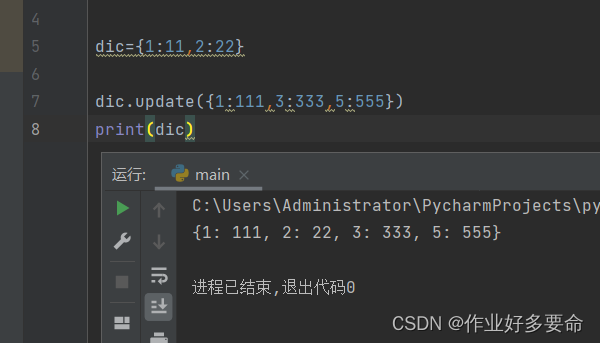 update:既可以进行修改数据又可以添加。当字典内没有键值时,就会新添加键与值。字典内有键值时,就会修改值的参数。