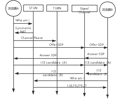 当浏览器A,B因为应用中的某种需要,要建立WebRTC在两个浏览器之间的直接连接,当A开始联系B时,首先通过WebSocket的WSS(通过https协议时)向信令服务器发送一个会话描述协议,信令服务器做中介,介绍两个互不相识的人认识。A发过来的是offer,信令服务器将这个会话描述协议发送到浏览器B,B收到会话描述协议之后回应一个answer,信令服务器再将其发送到A浏览器。交换完成会话描述协议后,两个终端之间开始尝试通过ICE候选字进行打洞,如果NAT类型符合要求可以成功就开始协商秘,到这里就可以进行一个安全的媒体数据会话了,这个会话流程如图1所示。