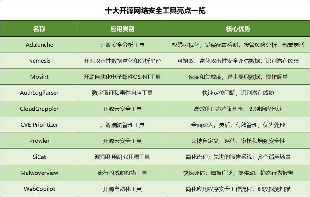 在本文中,我们盘点了近年来发布的十个能大幅提高工作效率的优秀开源安全工具,覆盖数字取证、云威胁检测、渗透测试、漏洞扫描、开源代码审核、应用安全评估等多个领域: