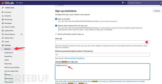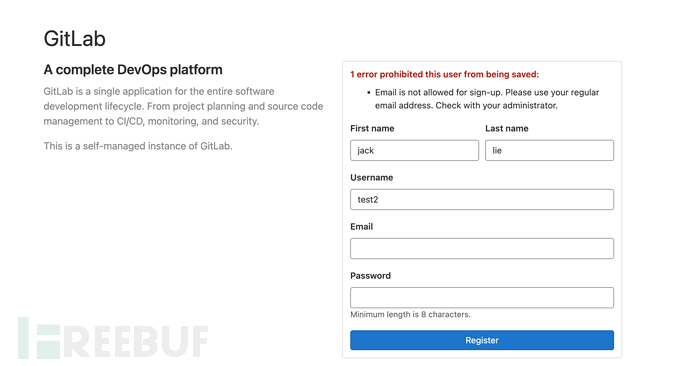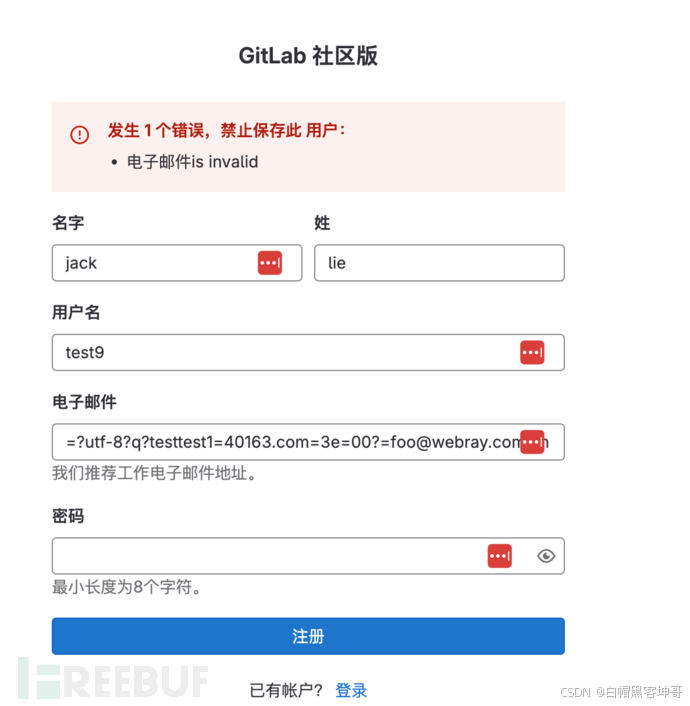 这个时候可以通过=?utf-8?q?testtest1=40163.com=3e=00?=foo@webray.com.cn对gitlab邮件限制进行欺骗,绕过域名注册限制。