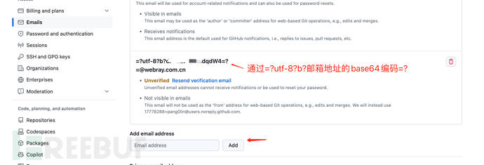 通过对邮件地址进行编码提供了另一种邮件地址表示方式,可以使用github的邮箱验证功能来复现这一特性。在github的settings->emails模块中,添加邮箱地址的base64编码后的值,可以在自己的邮箱正常收到github的邮件。