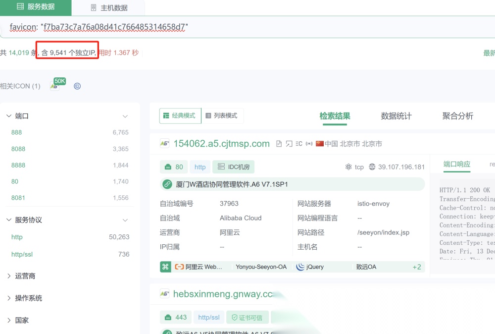 白盒一般分为两种方式获取源码,一种通过访问同样系统的其他网站看是否有弱口令能够进入后台,然后尝试RCE后脱出源码再去审计后横向来回利用,也就是我们常听的打供应链。检索同系统的方法:下列以致远OA举例,通过图标检索。