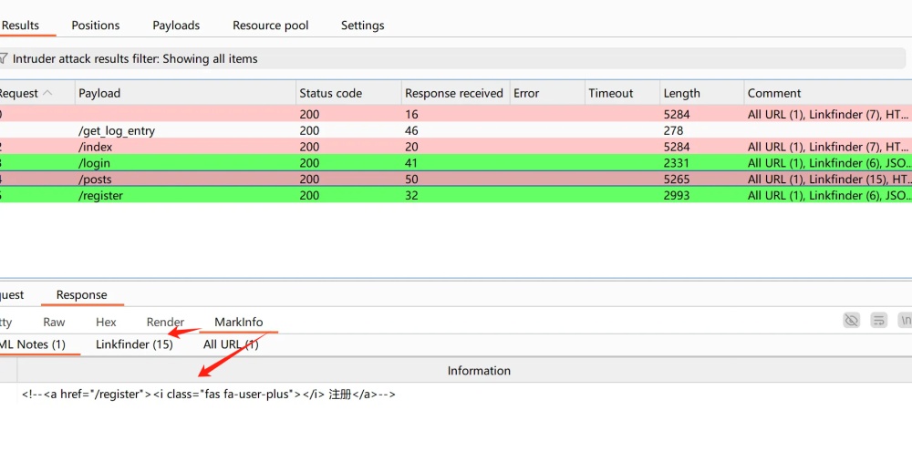 通过bp爆破来获取(这里拿自己的举例说明),通过不同颜色特征和Markinfo可以检索出特殊的响应信息