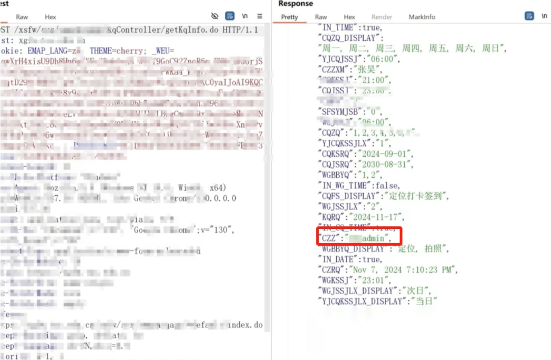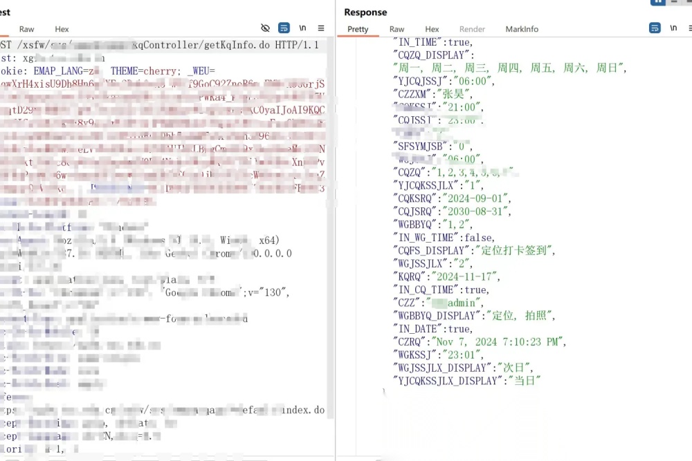 根据查找js文件和回显来找参数,或者用常见的一些参数来试试,平常也可以把这种接口传参自己搜集一些。拿到用户的工号和姓名还有电话📞,通过社工工具生成字典,密码可能为名字首字母缩写加电话号码末四位这种较为记忆的密码。