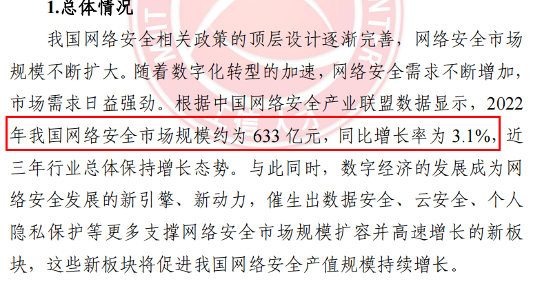 随着全球数字化产业蓬勃发展,网络安全市场规模也呈现持续增长的趋势,根据我国网络安全产业联盟数据显示,2022年我国网络安全市场规模约为633亿元,近三年总体保持增长态势。同时云安全等新板块也将促进我国安全产值规模持续增长。