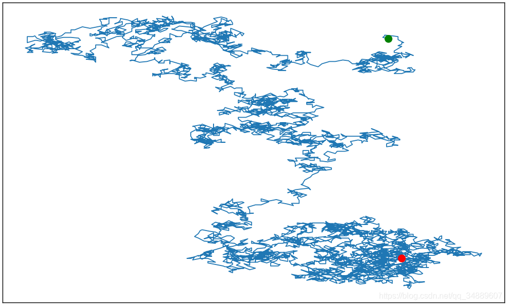 plt.scatter(rw.x_values[-1], rw.y_values[-1], c='red', edgecolors='none', s=75, zorder=2)