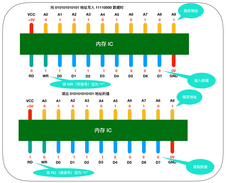 - 首先给 VCC接通 +5V的电源,给 GND接通 0V的电源,使用 A0 - A9 来指定数据的存储场所、然后再把数据的值输入给 D0- D7 的数据信号,并把 WR(write) 的值置为1,执行完这些操作后,即可以向内存 IC 写入数据