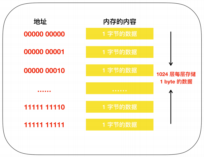 为了便于记忆,我们把内存模型映射成为我们现实世界的模型,在现实世界中,内存的模型很想我们生活的楼房。在这个楼房中,1层可以存储一个字节的数据,楼层号就是地址。下面是内存和楼层整合的模型图。