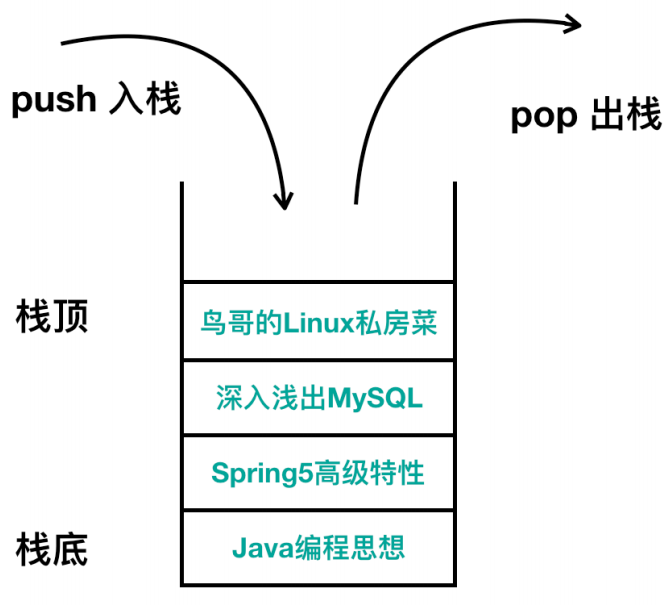 栈的数据结构就是这样,你把书籍压入收纳箱的操作叫做 压入(push),你把书籍从收纳箱取出的操作叫做弹出(pop),它的模型图大概是这样。