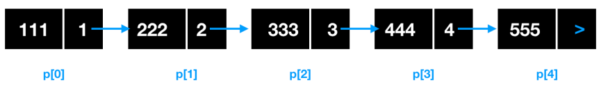 在实现数组的基础上,除了数据的值之外,通过为其附带上下一个元素的索引,即可实现 链表。数据的值和下一个元素的地址(索引)就构成了一个链表元素,如下所示: