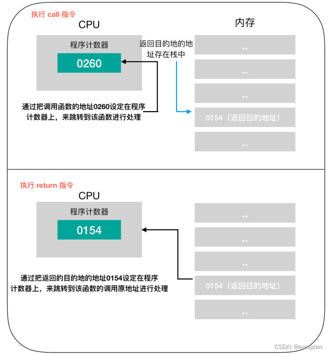 函数的调用和返回很重要的两个指令是coll和return指令,再将函数的入口地址设定到程序计数器之前,call指令会把调用函数后要执行的指令地址存储在名为栈的主存内。函数处理完毕后,再通过函数的出口来执行return指令。return指令的功能是把保存在栈中的地址设定到程序计数器。