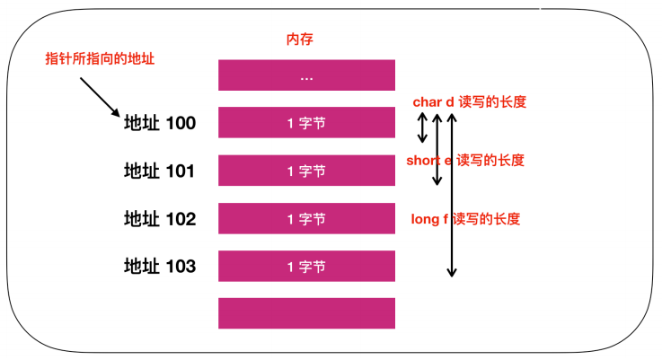 实际上,这些数据表示的是从内存中一次读取的字节数,比如 d e f的值都为100,那么使用char类型时就能够从内存中读写1byte的数据,使用short类型就能够从内存读写2字节的数据,使用long 就能够读写4字节的数据。