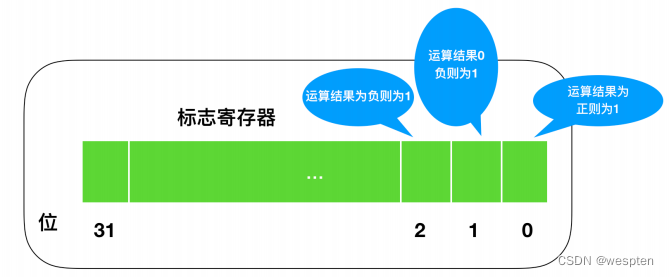 CPU 在进行运算时,标志寄存器的数值会根据当前运算的结果自动设定,运算结果的正、负和零三种状态由标志寄存器的三个位表示。标志寄存器的第一个字节位、第二个字节位、第三个字节位各自的结果都为1时,分别代表着正数、零和负数。
