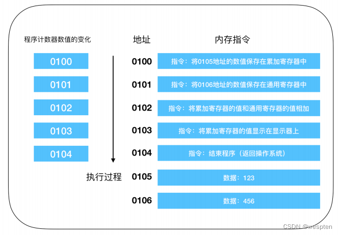 地址 0100 是程序运行的起始位置。Windows 等操作系统把程序从硬盘复制到内存后,会将程序计数器作为设定为起始位置0100,然后执行程序,每执行一条指令后,程序计数器的数值会增加1(或者直接指向下一条指令的地址)。然后,CPU就会根据程序计数器的数值,从内存中读取命令并执行,也就是说,程序计数器控制着程序的流程。