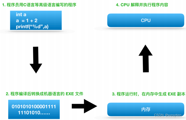在这个流程中,CPU负责的就是解释和运行最终转换成机器语言的内容。