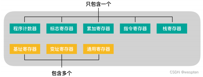 其中程序计数器、累加寄存器、标志寄存器、指令寄存器和栈寄存器都只有一个,其他寄存器一般有多个。