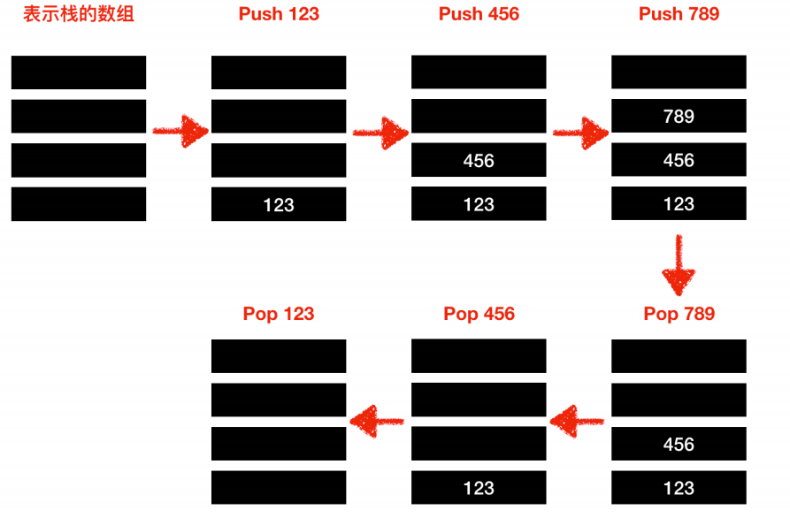 入栈相当于是增加操作,出栈相当于是删除操作,只不过叫法不一样。栈和内存不同,它不需要指定元素的地址。它的大概使用如下: