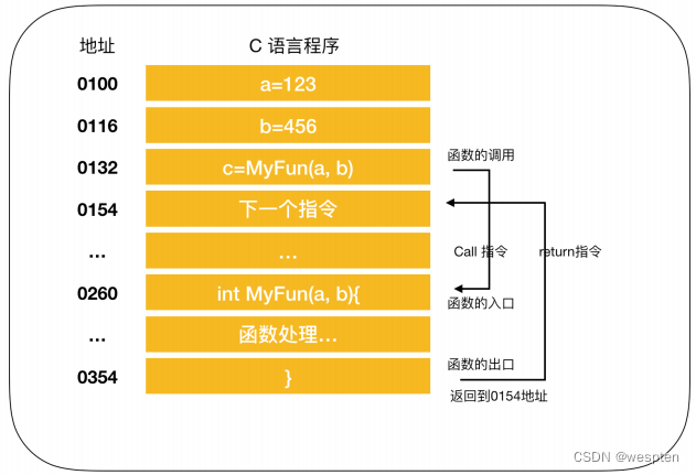 图中将变量 a 和 b 分别赋值为123和 456,调用 MyFun(a,b)方法,进行指令跳转。图中的地址是将C 语言编译成机器语言后运行时的地址,由于1行C程序在编译后通常会变为多行机器语言,所以图中的地址是分散的。在执行完 MyFun(a.b)指令后,程序会返回到 MyFun(a,b) 的下一条指令,CPU继续执行下面的指令。
