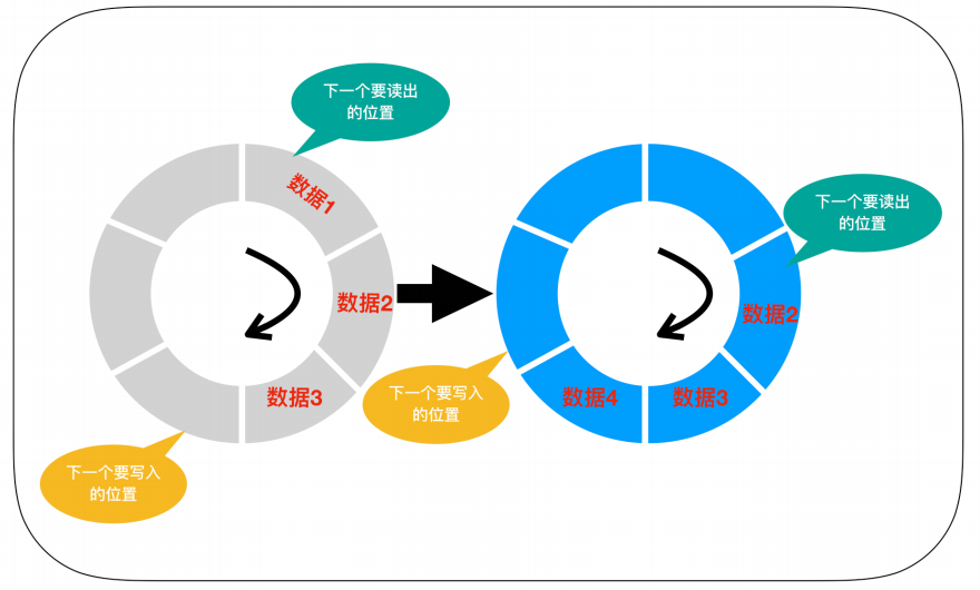 循环队列一般是以 环状缓冲区(ring buffer)的方式实现的,它是一种用于表示一个固定尺寸、头尾相连的缓冲区的数据结构,适合缓存数据流。假如我们要用6个元素的数组来实现一个环形缓冲区,这时可以从起始位置开始有序的存储数据,然后再按照存储时的顺序把数据读出。在数组的末尾写入数据后,后一个数据就会从缓冲区的头开始写。这样,数组的末尾和开头就连接了起来。