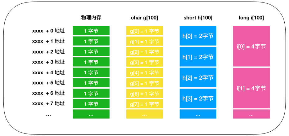 数组定义的数据类型,也表示一次能够读写的内存大小,char、short、long分别以1、2、4个字节为例进行内存的读写。