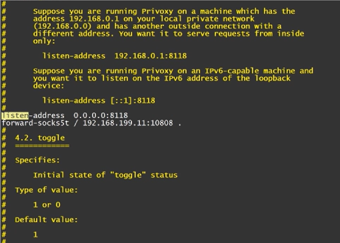 [root@localhost ~]# egrep '^listen-address' /etc/privoxy/config -A 1