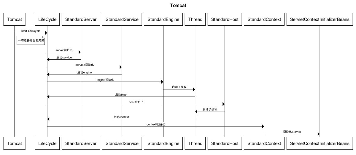 现粗略讲下大致流程初始化tomcat对象 -> 初始化连接器 -> 初始化Service组件 -> 初始化Host组件 -> 初始化engine组件 -> 初始化context组件 -> 初始化servlet容器