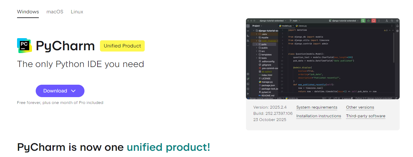 在新的版本中(2025年11月13日最后编辑时,版本是pycharm-2025.2.4),PyCharm做了大版本更新,将专业版及社区统一在了一起被称为Unified Product。