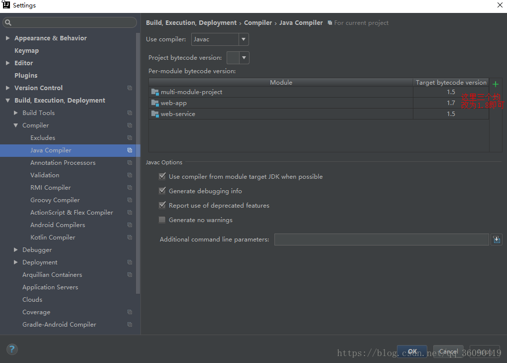 file - > settings - > java complier --->找到项目模块,修改为1.8就可以了。