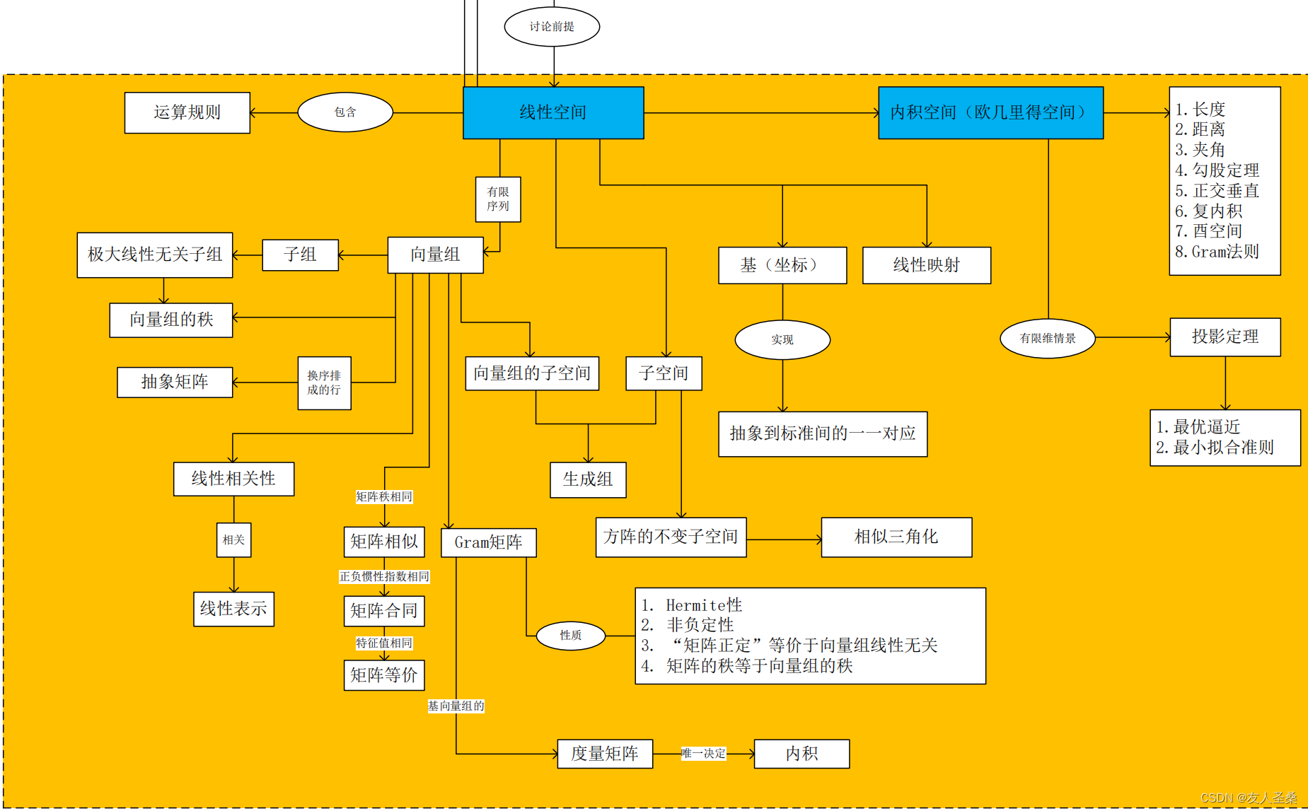 其实内积空间是属于线性空间的,是一种特殊的线性空间。但这里要单独提出。此处需要涉及范数,这个是数值分析中已经涉及过的知识,此处便不做介绍直接使用。内积空间即是赋范的线性空间加上内积运算的空间,以此在空间中引入了角度的概念。内积空间有距离、长度、角度等,有限维的内积空间也就是我们熟悉的欧氏空间。欧式空间也是我们很多实验进行的基础。在内积空间中应用最多的是“投影定理”,也就是正交与投影,投影矩阵的应用如最小二乘、广义逆、 PCA 等。