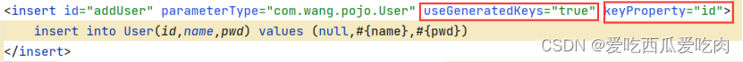 UseGeneratedKeys即是否返回主键,keyProperty表示主键返回到属性上,上述例子中,创建的user对象id为null,但是最后输出id为7,是因为keyProperty将主键值赋给了User的id.