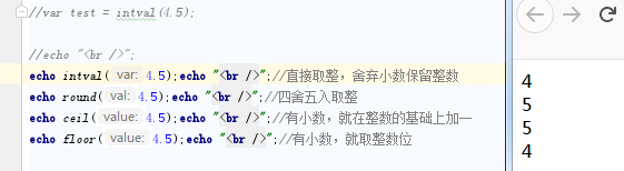 echo intval(4.5);echo "<br />";//直接取整,舍弃小数保留整数