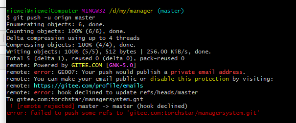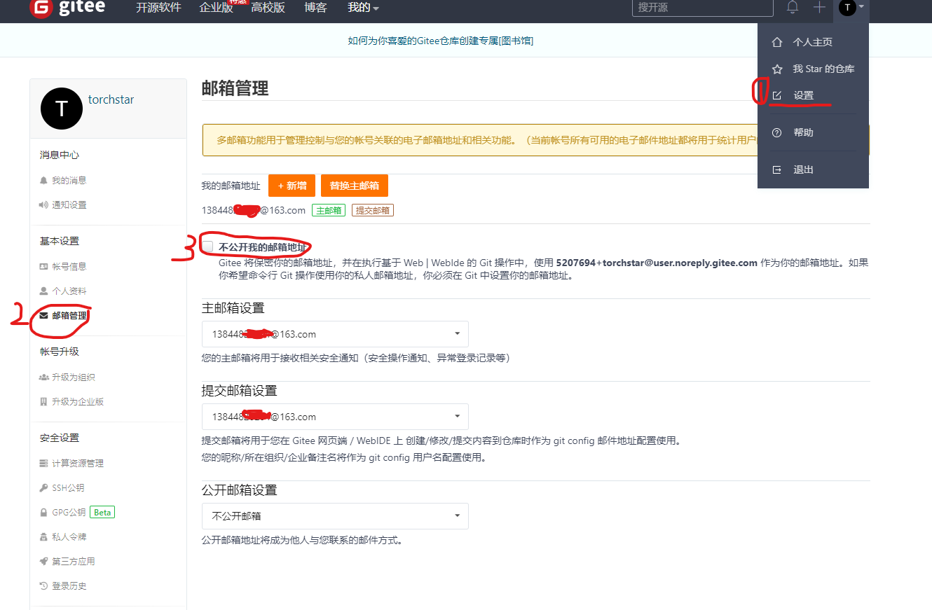 git提交gitee时的报错,提示必须将用户邮箱设置为公开的