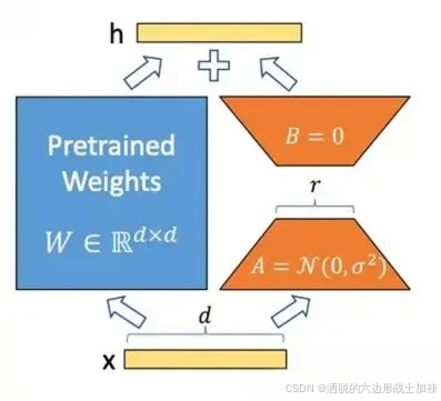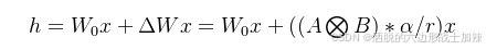 上面公式中x是这一层的输入,h是这一层的输出,是基础模型的权重参数;A和B是两个小矩阵,A的输入和B的输出形状和