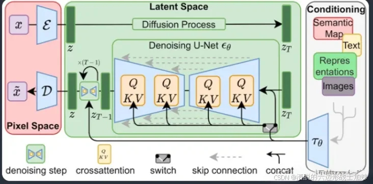 LoRA对Stable Diffussion模型中最关键的部分进行了微小改动:较差注意力层。这是模型和提示相遇的地方。研究人员发现,仅微调模型的这一部分就足以实现良好的训练结果。交叉注意力层在下方的Stable Diffusion模型架构中以黄色部分表示。