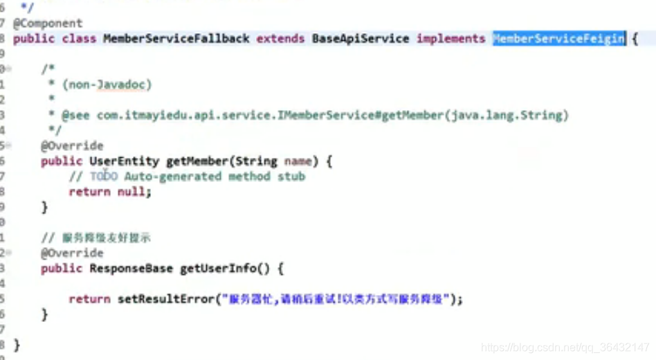 2.服务降级:高并发情况下,防止客户一直等待,使用服务降级方式(返回一个友好的提示给客户端,不会去处理请求,调用fallback本地方法,目前是为了用户体验)