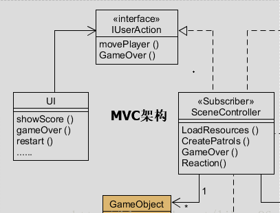 设计的重点是使用发布订阅模式完成Player、Patrol、SceneController以及ScoreManager之间的通信。首先定义了一个抽象类Subject.cs(发布者)和一个接口Handle