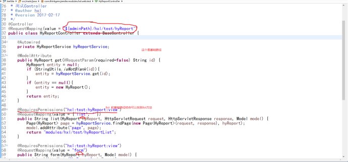 连接位置是controller文件里面的 @RequestMapping(value = "${adminPath}/hxl/test/hyReport")红色部位加一个/ 后面可以加 list或form (@RequestMapping(value = {"list", ""}) )