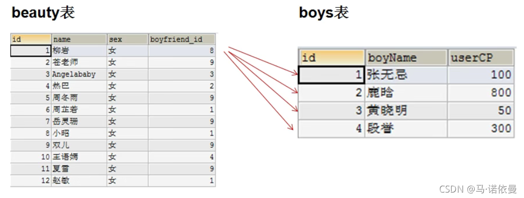WHERE beauty.boyfriend_id = boys.id; --添加有效条件