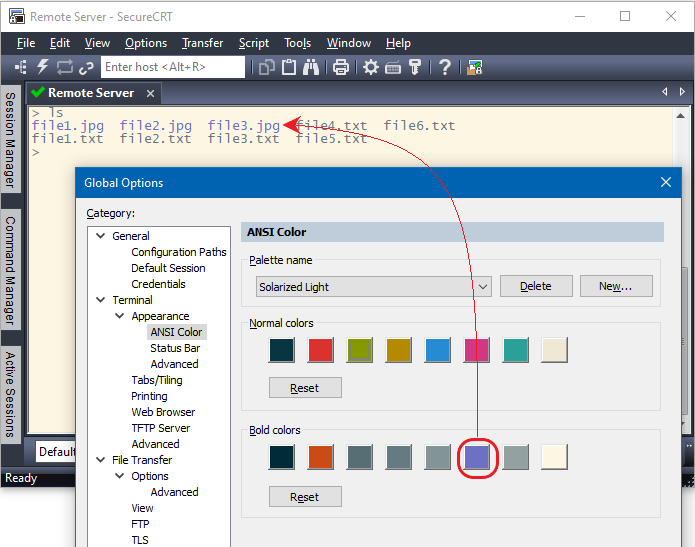 请注意,SecureCRT 中的配色方案是全局的,因此Session Options中的配色方案所做的任何更改都将全局反映在配置为使用相同配色方案的所有会话中。