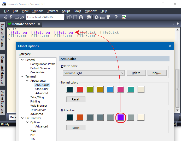 如果 SecureCRT 从远程主机/应用程序接收到正常的ANSI 颜色代码,SecureCRT 将使用所应用的配色方案定义的颜色显示文本。所有其他 ANSI 颜色代码都将导致文本根据Global Options中定义的 ANSI 颜色进行着色。