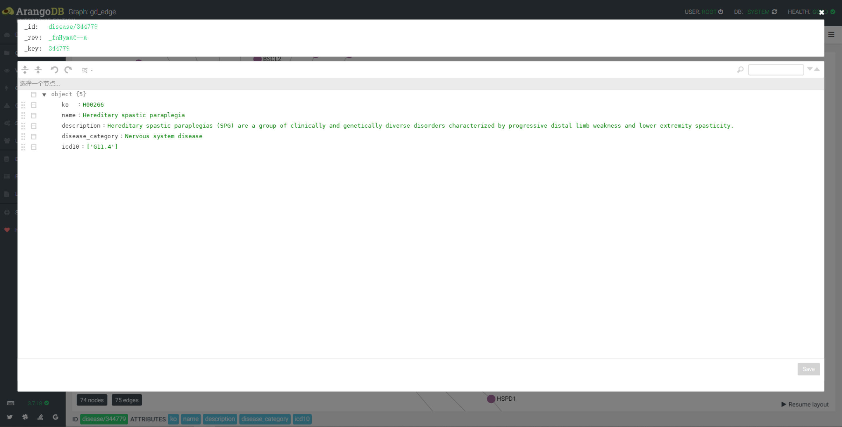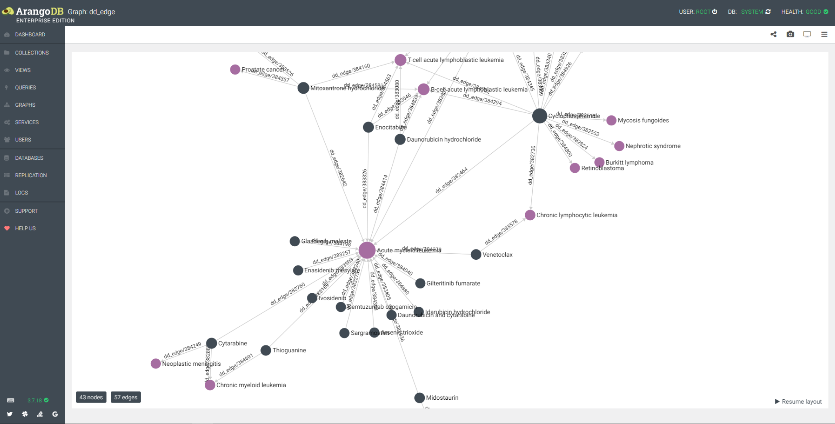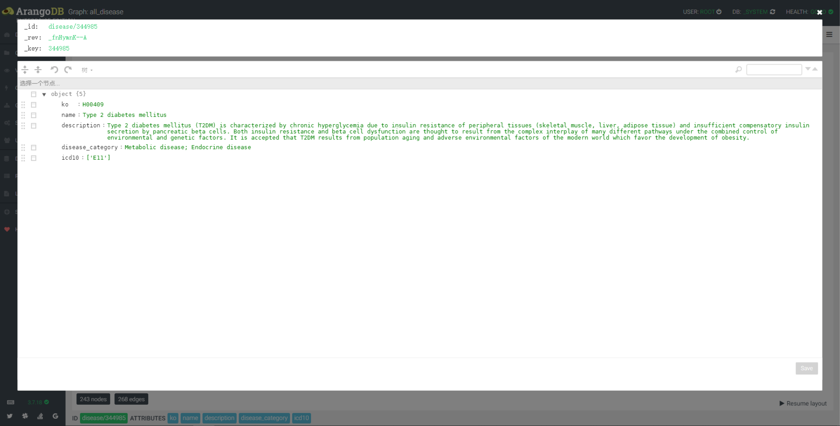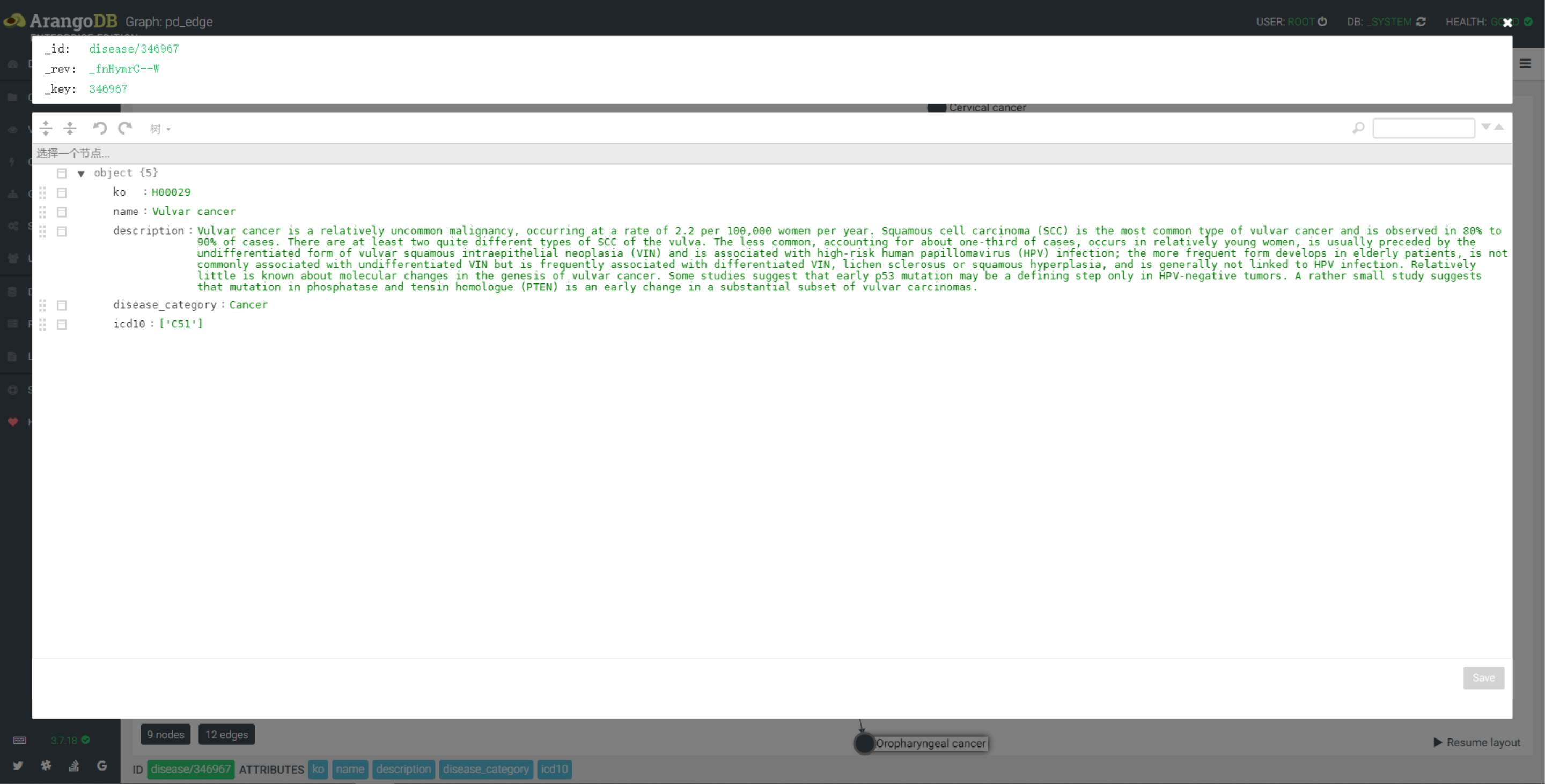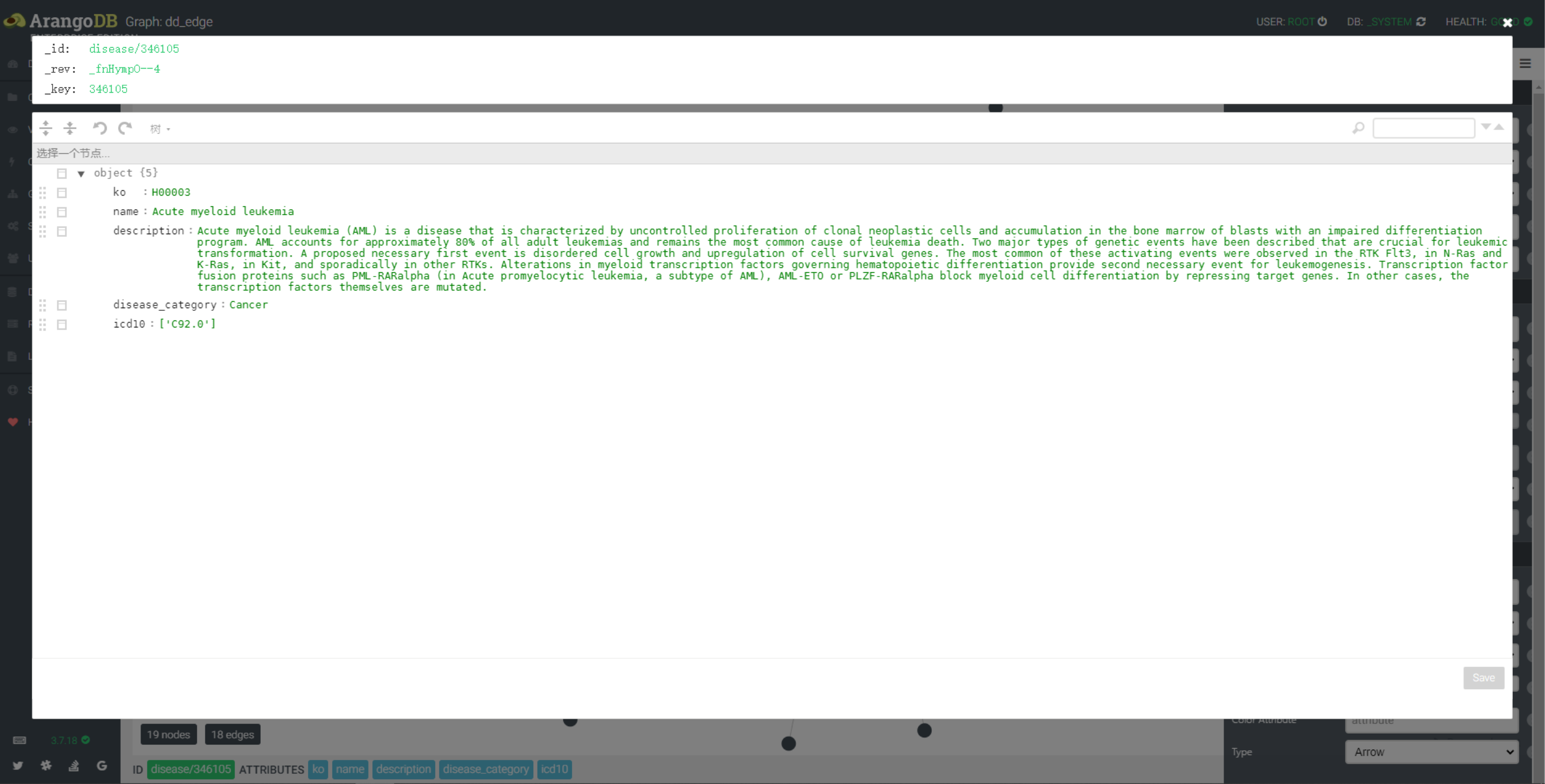 - dd_edge 图已疾病 disease/345300 为起点,2个深度图,以疾病和药物的名称显示
