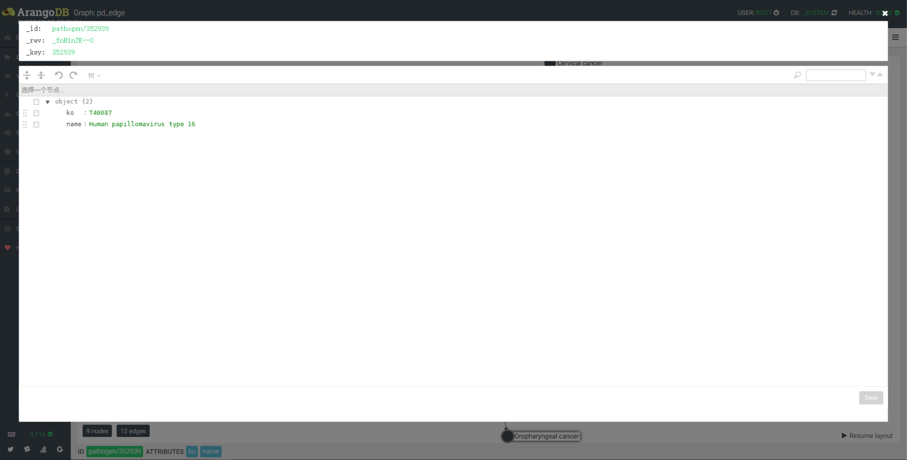 文章介绍了如何在ArangoDB中导入医学相关的JSON文档,创建疾病、药物、基因和抗原体之间的图关系。使用AQL语句查询特定疾病disease/345300关联的药物,以及进行多深度图检索,展示疾病、药物、基因和抗原体的复杂网络。此外,提到了可以反向检索,如从基因或病原体查找相关疾病和药物。
