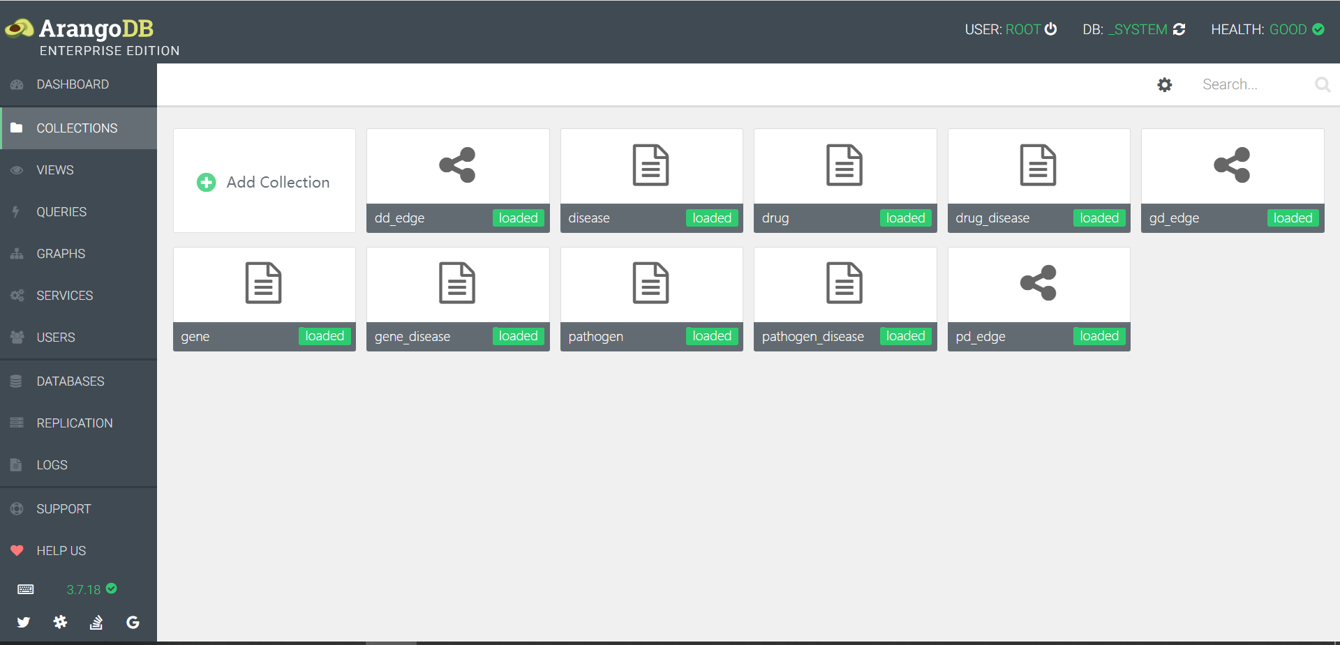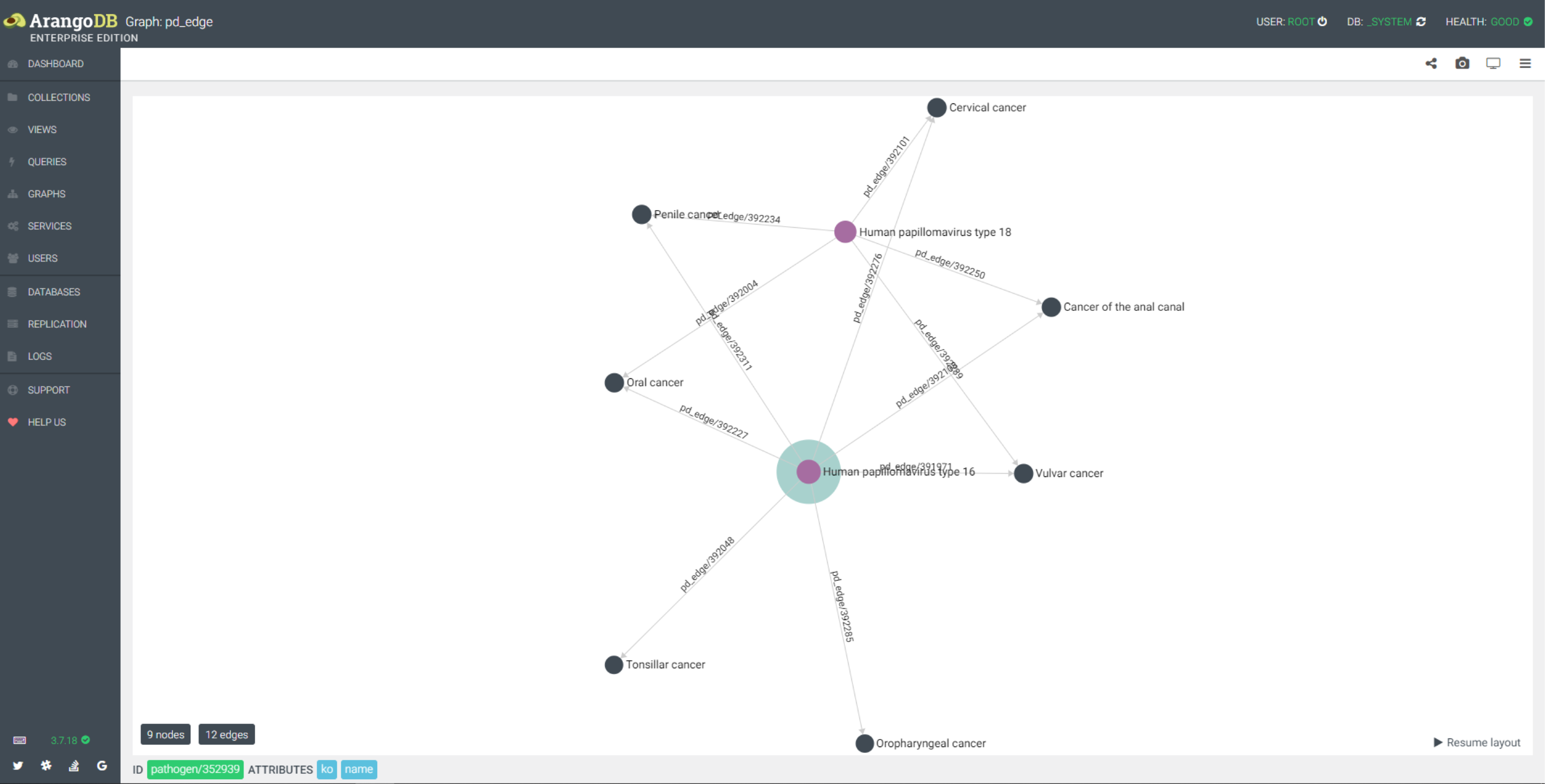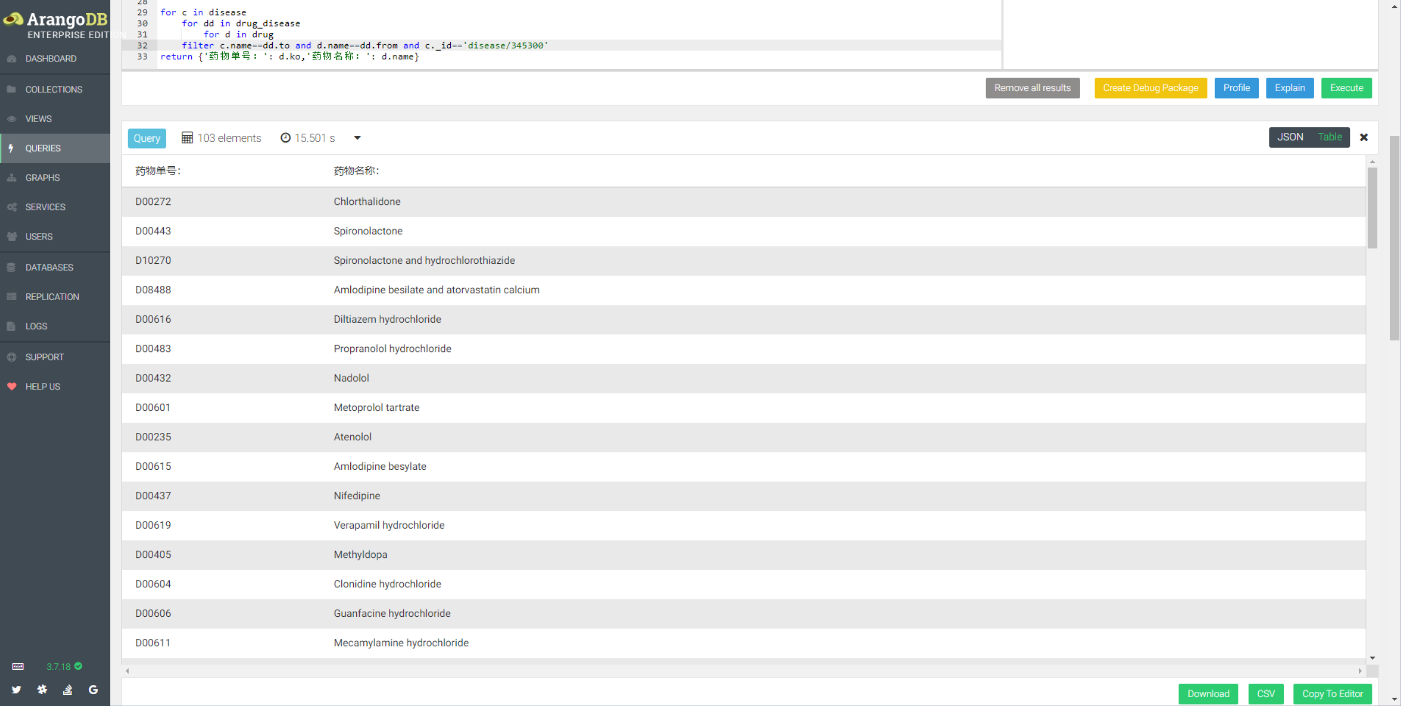 - 通过疾病查找对应的药物、病人的基因组和病原体,清晰查看节点之前的关系,还可反向检索如基因编号检索药物,病原体检索疾病及对应的药物等