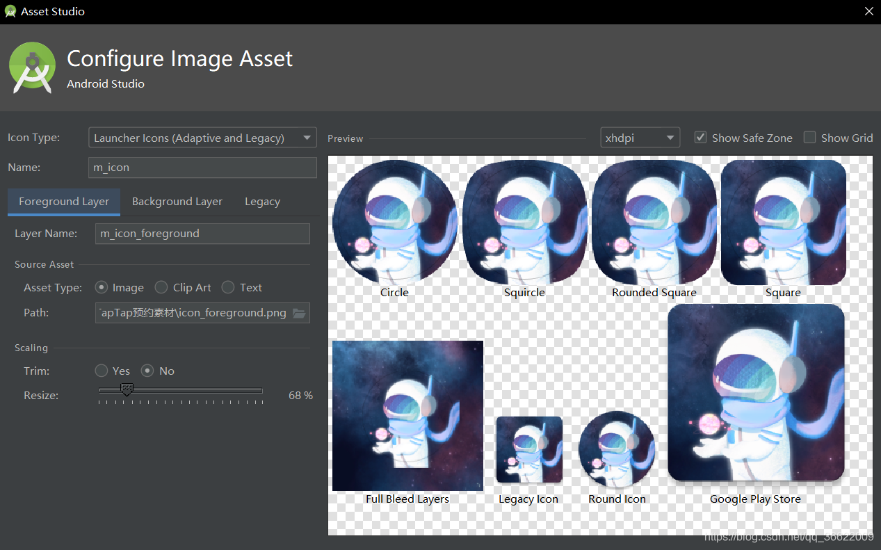 (3)分别选择前景和后景的图片。调整滑动条,直到图标显示正常,点击Next,就可以保存生成的icon文件了。(如果没有选择前后景图标的按钮,可能是Android Studio版本太低。在菜单栏的Help中选择Check for Updates升级版本)