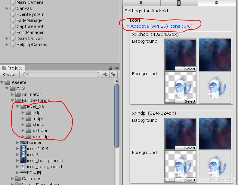 (5)重点来了!我们不需要把这些文件夹复制到Unity里去。我们直接把里面对应的图片保存下来。在Unity的Player Settings中拖拽赋值就好了。