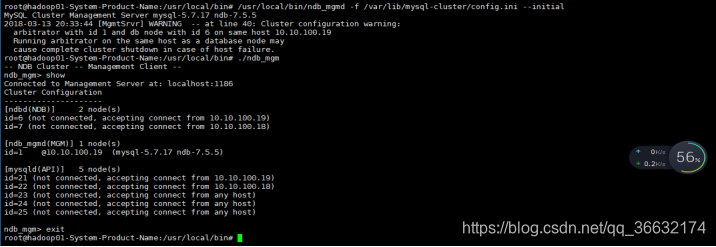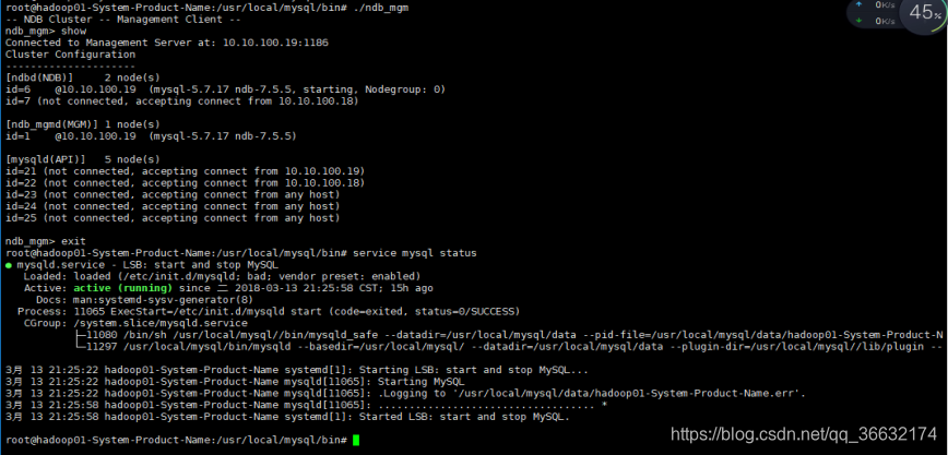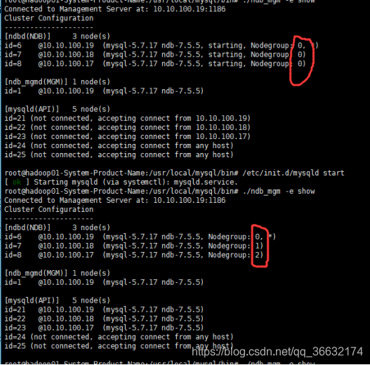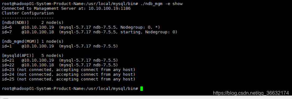 注意nodeid启动顺序基础上,在hadoop01配置的管理节点+数据节点+SQL节点,在hadoop02配置的数据节点+SQL节点完成如下为正确情况:/usr/local/mysql/bin目录下,./ndb_mgm -e show查看所有节点连接情况